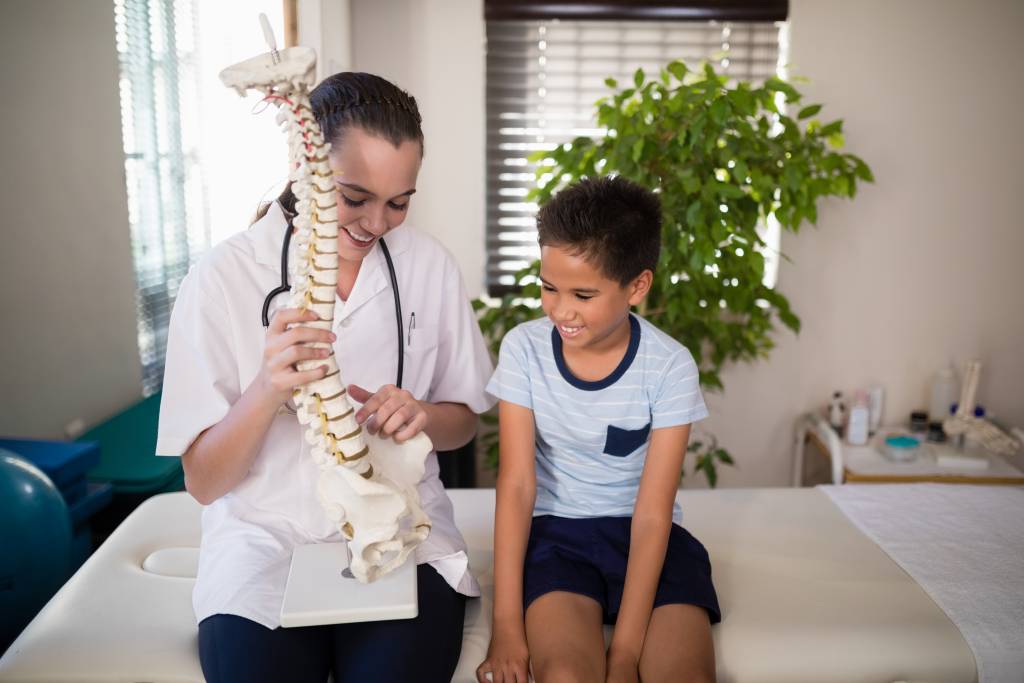 By pointing to the backbones of human skeleton, chiropractor diagnoses physical defects and explains pain. Close-up of medical assistant revealing osteopathy system and spinal cord.